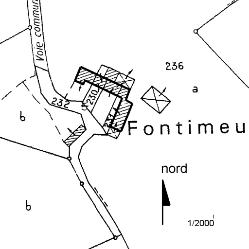 Fontimeu : ferme en granite, de plan allongé à fonctions multiples et escalier extérieur, datant du 17e siècle.