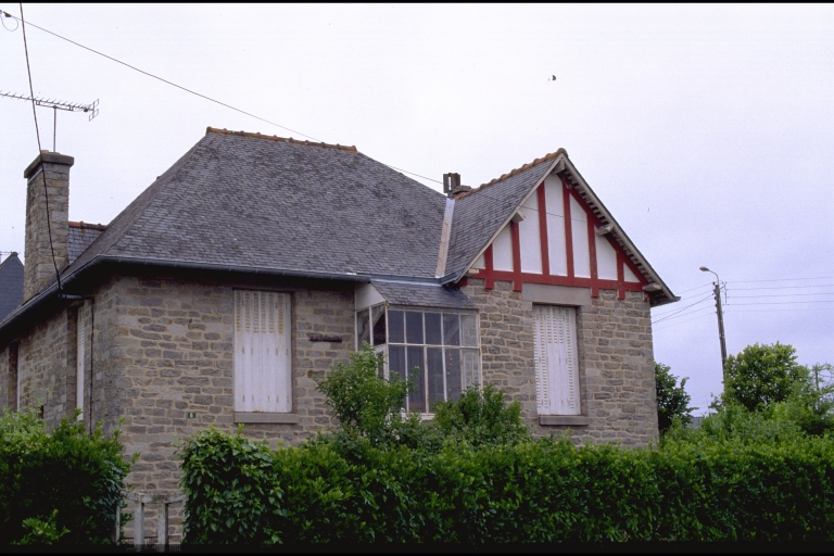 Maison de style régionaliste. Éléments de décor : toiture débordante, porche-auvent.