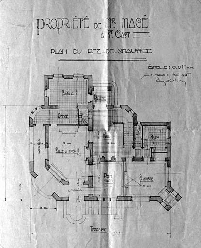 Plan du rez-de-chaussée, dessin, par Eugène Olichon, 1925 (A. P.).