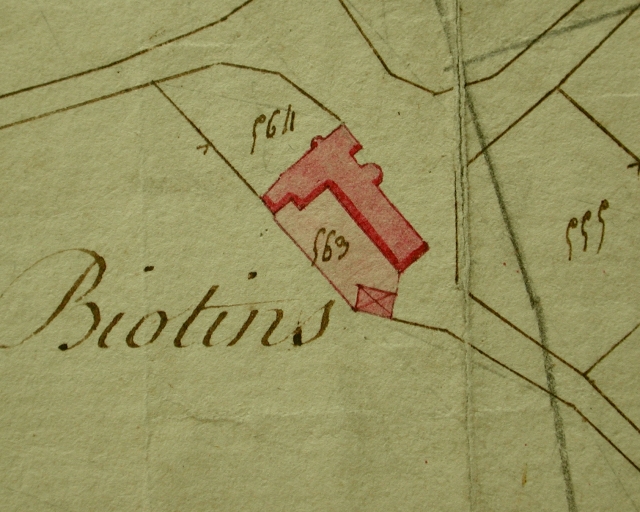 Logis remanié et dénaturé dans la 2e moitié du 20e siècle. Bâtiment réunissant une grange et une étable, construit en 1762 (porte la date). Cette ferme a possédé jusqu'au début du 20e siècle une grande litre au blason écartelé d´un cerf, de six merlettes, de sept étoiles et d´un lion supporté par deux lions et timbré d´un heaume cimé d´un oiseau. Un buste d´ange couronné occupait le bas de cette curieuse pierre. Selon Henri Frotier de la Messelière, le cerf pouvait être l'ancien blason des seigneurs du Val. La métairie des Champs Biotins faisait partie du domaine de Beaulieu et fut, à ce titre, confisquée nationalement à la Révolution. Acquise par Guillaume Nicolas, greffier de paix à Dinan, le 24 brumaire de l'an 4 (1795), la ferme des Champs Biotins appartenait au début du 20e siècle à Yves le Restif de la Motte-Colas, en Pléboule, et devint par achat la propriété de Joseph Allory le 5 février 1924. Peu de temps après, celui-ci rétrocéda la grande litre blasonnée à Yves le Restif de la Motte-Colas. Cette pierre orne aujourd'hui la cheminée monumentale du presbytère de Saint-Cast. Le procès-verbal de confiscation dressé le 1er Prairial de l'an 3 (1795) indique que la métairie des Champs Biotins possédait également une étable à brebis, deux porcheries et un cellier.