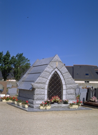 Croix en granite sur socle et emmarchement à quatre degrés (h. 600). Fût écoté, de section circulaire. Christ en ronde bosse. Croix en granite sur socle (h. 148). Christ en haut-relief sculpté sur la face est. Tombes en schiste, granite, kersantite ou marbre. Quatre tombes des ateliers Yves Hernot. Deux croix de tombe des ateliers Balavoine. Cinq croix de tombe en ferronerie. Christ en croix et Vierge Marie. Neuf croix de tombe en fonte moulée à décor végétal (blé, vigne, roseau). Christ en croix. Quatre croix de tombe en fonte moulée redentées et fleuronnées. Une croix tombale en schiste sur soubassement à trois degrés.