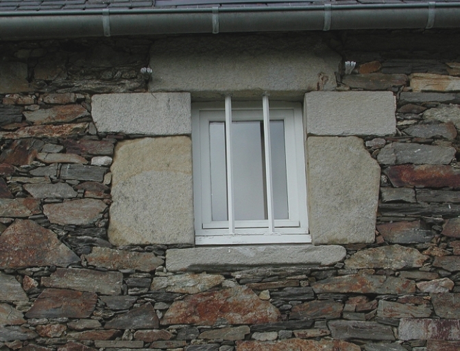 Maison de plan allongé construite en schiste, réunissant sous le même toit un logis à pièce unique et une étable. Os de moutons fixés dans le mur servant à sécher les filets et les raies.