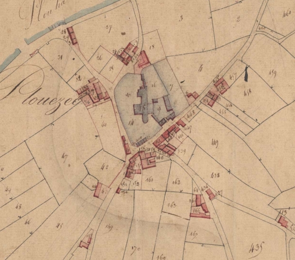 La chronologie des oeuvres recensées s'étend du 4e quart 17e siècle (1698) au 2e quart 20e siècle (1938). Les noms d'auteurs attribués par source et signature sont les suivants : Le Goff Elie (sculpteur), Hernot Yves (sculpteur), Cosson Louis (architecte), Guépin Alphonse (architecte), Léon Jean-Marie (entrepreneur), Guillou Yves (entrepreneur), Pastre Benoît (entrepreneur) et Rolland Paul-Marie (architecte). En dehors de la croix du Bourg, adossée au chevet de l'église paroissiale Saint-Pierre, il ne reste aucun édifice ou édicule antérieur à la Révolution. Le Bourg de Plouézec apparaît manifestement comme un ensemble homogène regroupant des constructions datées en majorité de la fin du 19e siècle et de la 1ère moitié du 20e siècle. Si le cadastre napoléonien laisse apparaître dès 1832 un ensemble de rues convergentes débouchant sur l'église et son cimetière, la construction de la mairie en 1912, placée entre le presbytère et l'église, est venue modifier la physionomie du bourg en entraînant la formation d'une place. Cette évolution a été relayée quelques années plus tard par l'aménagement de la gare de Plouézec (actuelle Place des Droits de l'Homme) et la construction de la station en 1923 par l'entreprise versaillaise Pastre Benoît, dont l'édification a nécessité la mise en état de viabilité d'un chemin donné par le docteur Le Marchand dans sa propriété de Run David pour accéder à la gare par l'école libre des filles (actuelle rue Guillaume Le Quéré).
