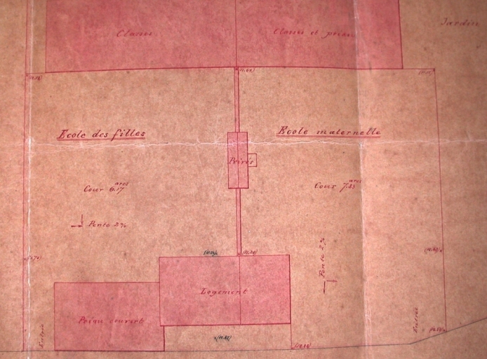 La partie habitation se compose d'une maison sur soubassement construite en grès pour le gros-oeuvre. Elle associe deux logis jumelés à double orientation, l'un à deux travées, l'autre de type ternaire. L'entrée de chaque logis est desservie par un un escalier droit en maçonnerie. L'encadrements des ouvertures est appareillé de granite clair en pierre de taille. L'utilisation et la mise en oeuvre du grès et du granite soulignent la composition de l'édifice et créent un effet de polychromie caractéristique. La partie scolaire se présente sous la forme d'un bâtiment de plan rectangulaire allongé, à treize travées.