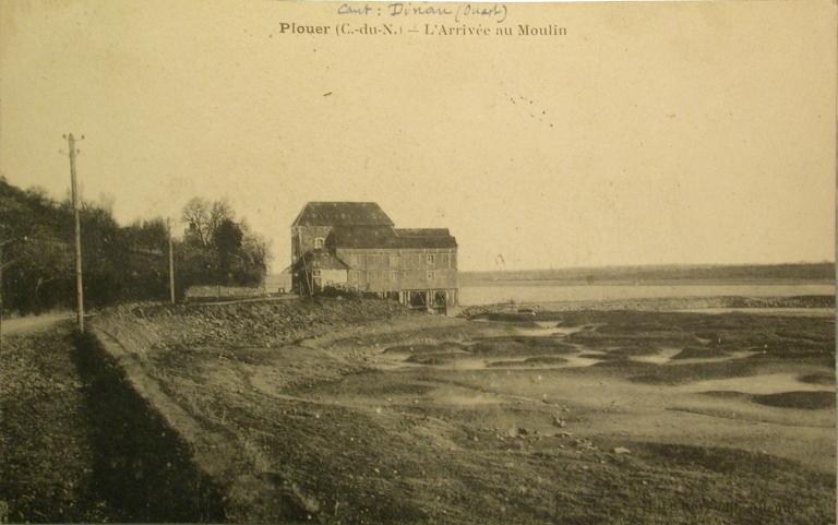 Le moulin de Plouër est mentionné dès le 15e siècle (en 1480) ; il s'agit alors d'un bâtiment sommaire édifié en bois. Il appartient à l'époque moderne à la famille de La Haye, seigneurs de Plouër. Il semble avoir été reconstruit en maçonnerie vers 1780. A cette époque et au début du 19e siècle, il appartient pour un tiers, à madame de Bizien qui en a hérité de son grand-père Jean Charles Pierre de La Haye, et pour les deux tiers restants à Auguste de Bizien et Jeanne de Robien, comme succession de Rosalie de La Haye de Plouër. Détruite au cours de l'hiver de 1830, la digue du moulin de Plouër est reconstruite la même année avec autorisation de l'avancer de 50 m vers la rivière. La surface de l'étang est ainsi augmentée d'environ 75 ares. Le 20 décembre 1835, Jean-Marie Burgot achète le moulin et l'étang. Par un contrat de vente daté du 2 avril 1879 passé chez Maître Lemée-Trébry, notaire à Plouër, Ernest Burgot (son fils) acquiert l'ensemble de la propriété comprenant le logement patronal. Le 22 septembre 1880, celui-ci est autorisé à prolonger de 5, 50 m vers l'est sa maison, située sur le bord du chemin conduisant du moulin à la cale de Plouër. En 1902, la minoterie est agrandie côté mer et E. Burgot fait réparer la digue afin d'empêcher l'enlèvement de la marne qui lui sert d'appui. La digue est formée d'enrochements jetés sur la vase et retenue par des pieux plantés dans la vase. La crête seule est maçonnée et formée de moellons posés sans mortier ; elle est percée de deux déversoirs et d'une écluse pour le remplissage. A partir de 1926, la minoterie est exploitée par la famille Dibonnet et Gourga. En 1936 la capacité d'écrasement journalier de l'usine est de 130 q ; elle passe à 150 q trois ans plus tard. Le 15 décembre 1941, formation d'une société entre Emile Gourga fils et Romain Dibonnet fils inscrite sous la raison sociale Société du moulin de Plouër Dibonnet et Gourga fils. Le 11 octobre 1947, Dibonnet fils laisse ses fonctions de cogérant à son père, avant que celui-ci ne cède ses parts le 12 décembre 1947. La société n'est plus gérée que par le fils Gourga. La minoterie cesse de fonctionner en 1970. Après avoir été occupé par un atelier de confection, le bâtiment, restauré, abrite actuellement des logements et un bureau d'études d'architectes. En 1480, le moulin de Plouër abrite deux roues à aubes. En 1902, le moteur hydraulique se compose de deux turbines développant une force totale de 55 ch. A partir de 1929, suite aux pluies torrentielles qui se sont abattues sur la région, le moulin est actionné par un moteur diesel. En 1936, la force motrice est fournie par un moteur à gazoil, de type Ruston, qui développe 60 ch ; la minoterie est électrifiée par la suite. En 1936, le matériel de mouture se compose de cinq broyeurs, six convertisseurs, deux plansichters, une bluterie centrifuge, deux bluteries rondes et une hexagonale. En 1939, la minoterie de Plouër emploie huit salariés.