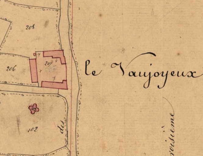 Vestiges de l'ancien manoir de Vaujoyeux se présentant sous la forme d'un colombier construit en granite, schiste, grès et poudingue, constitué d'un massif carré sur lequel se greffent aux angles quatre tours couvertes d'une coupole en pierre portée à l'intérieur par un arc surbaissé. Porte d'entrée feuillurée. L'appareil est formé d'une alternance de lits de grès et granite et d'assises en poudingue et granite à l'intérieur. Les blocs sont séparés les uns des autres par des trous de boulins alignés (au total 1060 trous de boulins). Jour central sommé d'un toit en croupe.