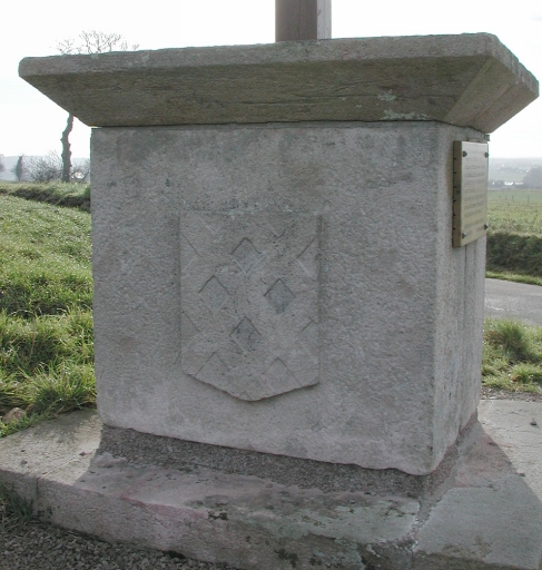 Croix de chemin en bois avec niche à statuette dressée sur un soubassement de granite coiffé d'une corniche et flanqué d'un écusson sculpté (côté ouest) aux armes de la famille de la Motte Rouge. Inscription gravée sur bois (côté face).