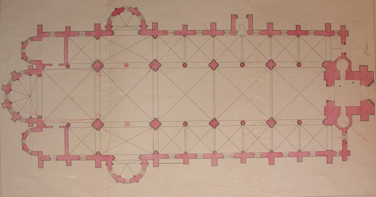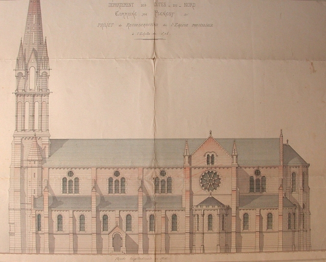 Le projet de reconstruction ou de restauration de l'église paroissiale de Pléneuf fut avancé dès 1864 par le recteur Louis-Charles Dobet-Desforges. L'architecte départemental Guépin fut choisi pour soumettre un premier projet qui fut ajourné par la municipalité de Pléneuf en 1868. L'actuelle église paroissiale Saint-Pierre et Saint-Paul de Pléneuf date du 4e quart du 19ème siècle. Elle fut construite de 1889 à 1890 à l'initiative de François Jaffrain, nommé recteur de la paroisse le 5 février 1887, par l'entrepreneur Corbin d'après les plans de l'architecte Le Guerrannic dressés le 31 août 1887. Bien qu'il fut approuvé par le conseil des bâtiments civils, le projet initial fut ajourné par les inspecteurs-généraux du diocèse le 7 mars 1888. Un deuxième projet vit le jour en mai 1888, approuvé cette fois par le comité diocésain, et l'adjudication des travaux fut prononcée le 15 janvier 1889. Au mois d'avril 1890 une grande partie des travaux était achevée. La bénédiction de la première pierre [fig. 4] eut lieu, selon René Couffon, le 30 juin 1889 et l'édifice fut consacré en présence de Mgr Fallières le 9 août 1891. Faute de ressource suffisante, le clocher ne fut achevé qu'en 1895 ou 1897 selon René Couffon. L'adjudication des travaux eut lieu le 16 février 1895. Les quatre rapports annexés en documentation [Annexe 1 à 4] fournissent de précieuses informations sur le contexte économique et social qui détermina la reconstruction de l'église paroissiale de Pléneuf. Outre le fait de présenter une description de l'ancienne église, datant vraisemblablement de l'année 1722 et remaniée au début du 19ème siècle selon Le Guerrannic, cette documentation révèle aussi les incertitudes qui pesèrent sur le bon déroulement du chantier pour des raisons financières (la demande de secours fut accordée par le ministère de l'intérieur et des cultes à hauteur de 10 000 francs le 26 juillet 1894). Au sud-est deux piliers ainsi qu'un echalier datant du 18e siècle signalent l'entrée de l'ancien cimetière [fig. 18].