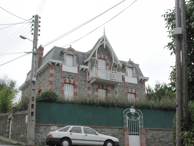 Maison à double orientation construite en granite, grès et brique. Edifice de plan massé au volume cubique construit sur un étage de soubassement. Eléments de décor : pignon à ferme débordante en façade antérieure, encadrements des ouvertures et chaînages d'angles polychromes (brique et grès rose), lucarnes architecturées, corniche à modillons, ferronnerie (portail), épis de faîtage.