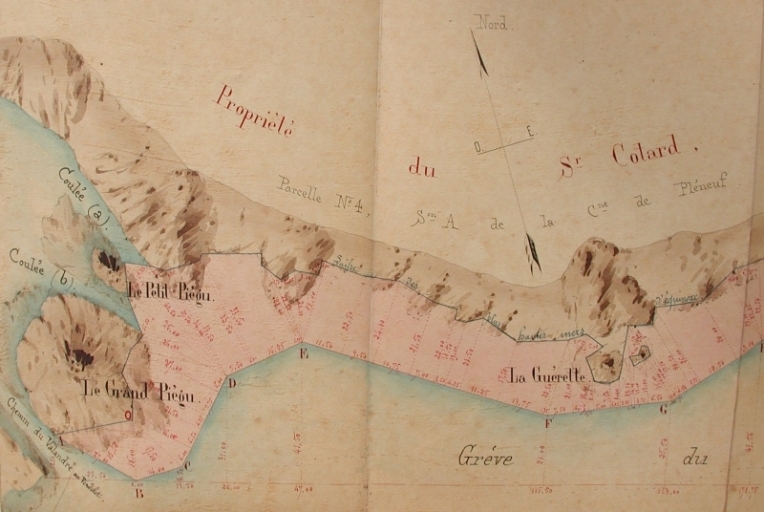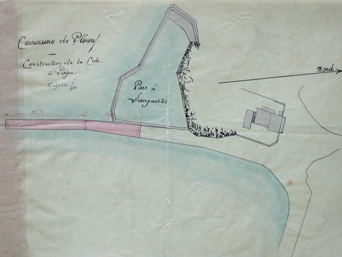 La plage du Val-André est orientée face au nord-ouest. La jetée de Piégu, construite par la commune de Pléneuf, est située à l'extrémité nord de la plage et est orientée à peu près nord-sud. Le mouillage constitué par la jetée de Piégu offre un bon abri quelle que soit la direction des vents. Il est protégé par la côte contre les vents du sud, par la pointe du Château-Tanguy contre les vents du nord et de l'est, par la jetée contre les vents d'ouest. Le premier projet de création d'une jetée d'une centaine de mètres à l'emplacement de l'ancienne pêcherie de Piégu date du 21 octobre 1883. Il fut refusé par les Ponts et Chaussées qui considéraient que compte tenu du petit nombre de plaisanciers et de pêcheurs, des travaux aussi importants étaient inutiles. Il était alors plus urgent de s'occuper de l'aménagement du port de Dahouët. L'aménagement du port de Piégu a commencé par la réalisation de la cale, oeuvre privée de Charles Cotard à la fin du 19e siècle, lorsque ce promoteur immobilier entreprit d'endiguer le site pour y construire son habitation et par la suite les murs du quai Célestin-Bouglé. Le "père fondateur" de la station balnéaire du Val-André souhaitait ménager le long de la Ville-Pichard des emplacements pour des villas, construire un chemin en amont (les prémisses de la digue-promenade), pour contribuer au développement de la plage du Val-André. L'endiguement projeté devait prévenir l'érosion de la falaise et être aussi utile pour l'embarquement des pêcheurs, des baigneurs et des plaisanciers. En 1885, les premiers plans de l'ingénieur Guillemoto révèlaient les projets de Cotard qui furent approuvés en 1888 par l'octroi d'une première concession sur le domaine public maritime autour du Grand Piégu, en limite avec le chemin du Verdelet, jusqu'à la pointe de la Guérette et autour du Petit Piégu. En 1885, Cotard, demanda l'autorisation d'occuper le domaine public maritime au sud de la pointe des Guettes, afin de réaliser à partir du mur de l'ancienne pêcherie de Piégu une digue servant de brise-lames (de 1 m 50 de hauteur), avec un poteau en bois, servant de balise à son extrémité. Une carrière fut ouverte au pied de la falaise de la Ville-Pichard pour extraire les matériaux utiles à ces constructions, en plus des pierres de l'ancienne écluse. En 1891, Cotard obtint l'autorisation d'occuper 3489 m2 sur le domaine public maritime pour l'établissement d'une piscine (futur vivier Hernandez), une cale, une digue submersible et un balisage adéquat. Le service des douanes pourrait sur ce terrain construire une cabane de refuge ou une guérite pour fonctionnaire. En 1903, le président des propriétaires obtint de la commune une subvention de 1000 frs pour la construction d'une cale en pente douce de 3 m de large. Cette modeste cale constituait un bien précaire abri. La cale de pierres sèches, toujours visible aujourd'hui, intégrée à la nouvelle digue, représentait encore dans le 1er quart du 20e siècle le seul ouvrage portuaire, faisant office d'avant-port à Piégu. Cet petit havre était peu fréquenté, seulement par quelques bateaux pendant l'été : L'Evêque, Denis, Lecorguillé et le bateau à vivier de Hernandez, propriétaire du vivier attenant. Cependant, cette cale n'était plus entretenue, les brèches étaient fréquentes et des dépôts sauvages de pierres gênaient l'accostage. Le port de Piégu présentait surtout un intérêt pour les besoins du tourisme et de la navigation de plaisance. L'administration n'a pas jugé nécessaire en 1936, malgré la demande de la municipalité d'établir un feu fixe sur la jetée de Piégu, en dépit de présence d'une ligne électrique à proximité. La jetée de Piégu a été construite par la commune de Pléneuf en 1931, avec subvention de l'Etat et du département. La commune s'engageait à prendre à sa charge la totalité des frais d'entretien ultérieur de l'ouvrage. Cette jetée se terminait par un escalier qui descendait directement à la plage. L'inauguration eut lieu le 9 août 1931 et la fête fut présidée par le ministre de la marine marchande. Cependant, le fonctionnement essentiellement local et non commercial du port n'apportait pas d'argument suffisant pour que l'Etat accepte d'installer à ses frais un feu sur la jetée.