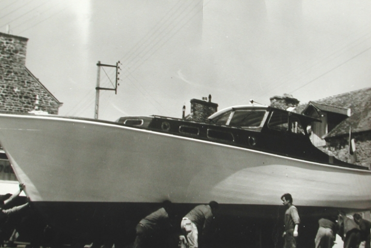 le chantier Tocqué : le dernier chantier de construction navale de Dahouët En 1952, Pierre Tocqué installa son chantier naval sur le port de Dahouët. Spécialisé dans la plaisance, il construisit de nombreux yachts de caractère de 7 à 12 mètres sur les plans des architectes Cornu, Vernette, Sergent et sur ses propres plans. Il réparait aussi les bateaux de pêche locaux. Pierre Tocqué raconte avoir reçu de son aïeul Pierre Alain, ancien responsable des chantiers navals Minier de Binic, le goût de la construction navale. Il fit son apprentissage au chantier Huon de Paimpol. Après la Guerre, il s'installa à Saint-Brieuc, rue des Trois-Frères- Legoff, à l'enseigne : Constructions navales - Dinghy - Cormoran - spécialité de bateaux en forme. C'est au Val-André que ces dinghies ont fait leurs preuves, lors des premières régates de la station, et c'est peut-être ce qui l'incita à venir à Dahouët en 1952. La première bâtisse qui servit de dépôt pour le matériel de voilerie et de charpente, pour le rangement du matériel nautique du chantier naval Tocqué, se situait dans les anciens entrepôts de Péniguel (fille de l'armateur Carfantan, cadastrés H 498 aujourd'hui), avant que le chantier ne déménage sur la rive gauche, dans un premier bâtiment en bois, avant la construction d'un second hangar, en fibrociment, de 150 m2 fut ensuite construit (à l'emplacement actuel d'une entreprise de mareyage). Les différents documents photographiques des constructions Tocqué témoignent de l'évolution de l'environnement et du bâti portuaires de Dahouët de 1960 à 1975. Les activités maritimes, pêche, plaisance et cabotage ne fonctionnaient pas encore de façon concurrente dans l'espace portuaire. Témoignage de Robert Bouguet, ancien ouvrier charpentier du chantier Tocqué : De 1956 à 1962, le chantier employait seulement deux ouvriers. La voilerie était dans les gerbières, "le grenier à patates des Carfantan". La scierie se trouvait en bas ; on sciait tout à la main, on maniait aussi l´herminette pour profiler les quilles, la râblure était entaillée au ciseau à bois, et les mèches américaines étaient manoeuvrées au vilebrequin, pour faire traverser les boulons de quille. Il y avait une grande cheminée pour la machine à vapeur en briques. Le chantier construisait des bateaux en bois, particulièrement soignés, sur membrures franches doublées de membrures ployées, bouillies, avec bordées calfatées en coton et mastic. L'accastillage en bronze était fourni par la fonderie Nivet de Plérin ; les voiles étaient confectionnées par la voilerie Richard de Saint-Malo. Quels sont les bois employés ? Les petits fonds et les pièces maîtresses sont en Iroko, les membrures en acacia rivées en cuivre, les hauts en acajou et sipo. D'autre-part, les ferrures et gréements sont en acier inoxydables. La construction est à franc-bord. L'une des plus belles réalisations fut en 1962 "L'Ecrelle", un ketch du type Cap Nord de l'architecte naval Vernette. 10,20 m de long pour un poids total de 6 tonnes, ayant un tirant d'eau de 1,60 m, doté d'un moteur Couach diésel de 30cv et d'une voilure de 49 m2. Le chantier propose encore des "Bars" et des canots creux ou demi-pontés de 5,50 m pour la plaisance locale, des coques à quille longue et arrière canoë ou "norvégien" ("Clophidi", "l'actuel" Carusie II), plus rarement à tableau ("Sitala"), et des vedettes pour la riche clientèle résidente au Val-André (Antinéa, la première et Rheginéa la seconde). Il va aussi construire "la Madelon" pour le pilote Morvan de Dahouët. En 1962, le chantier Tocqué employait 6 ouvriers dont Auguste de Partau, Claude Rouault, Francis Charles, Pierrick Bogué et Robert Bouguet (photo Ouest-France). Ce dernier ouvrier s'installera à son compte sur les quais, après le décès accidentel de Pierre Tocqué en 1974. En 1963, Pierre Tocqué fera le projet de construire un hangar de 24 x 20 m au Pont Carla. La dernière construction de Pierre Tocqué sera "Jacquez", joli sloop demi-ponté. L'un de ses derniers bateaux sera acheté par le petit fils du poète Richepin : "Alcyon".