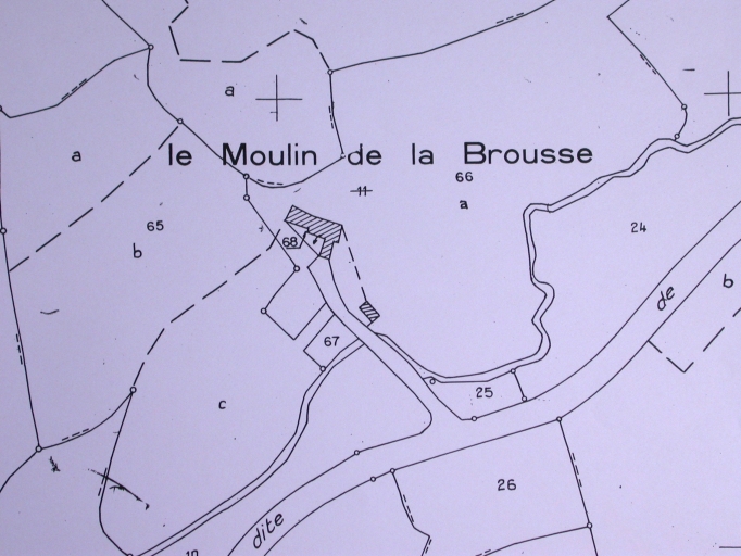 Le moulin à farine de la Brousse est attesté sur ce site dès 1558 (extrait de l'aveu fourni par la Chambre des comptes de Bretagne). Propriété du sous-préfet de Lisieux M. Coniac, il est vendu en 1838 à Alexandre Gustave. Exploité par Jean-Marc Jouan en 1848, il produit alors de la farine de seigle, d'avoine et de blé noir, distribuée dans les communes d'Allineuc, du Bodéo (22) et de Merdrignac (22). Vers 1865, il devient la propriété d'Ange Huchet de Quénétain qui le cède à son tour à Louis-Joseph de Castellan en 1875. En 1907, le moulin de la Brousse et le logement du meunier sont agrandis. En 1913, le moulin est démoli avant d'être entièrement reconstruit la même année. En 1924, il passe aux mains d'Hervé Joseph et cesse de fonctionner en 1956. En 1983, les nouveaux propriétaires restaurent à l'identique le moulin et ses dépendances, ainsi que l'ensemble des différents ouvrages régulateurs, les paires de meules et installent une nouvelle roue hydraulique. Durant son activité, le moulin est actionné par une roue hydraulique verticale à augets qui met en mouvement deux paires de meules, toujours en place. En 1848, le moulin de la Brousse donne du travail à six personnes.
