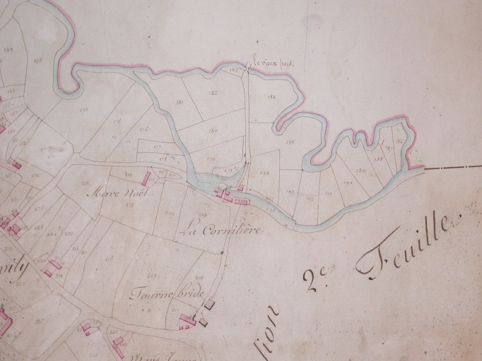 Le moulin de la Cornilière a été réglementé par arrêté préfectoral du 19 septembre 1871 ; à cette date, il appartient à Sébastien Tardivel. Ses ouvrages régulateurs se composent alors d'un déversoir présentant un débouché libre de 11, 50 m et un vannage de décharge mesurant 8, 22 m de largeur est installé à cette époque. En 1868, le moulin est actionné par trois roues hydrauliques verticales désservies par une seule vanne motrice.