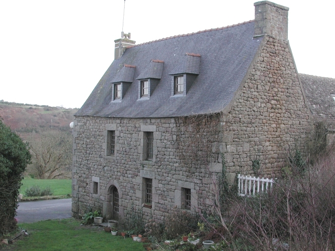 L´architecture domestique est agricole fournit l´essentiel du corpus des oeuvres repérées sur le territoire communal. Les bâtiments sont construits majoritairement sur un plan rectangulaire simple en profondeur (seuls le château de Kerninon et la maison de notable sise au lieu-dit " Le Corvézou " présentent un plan double en profondeur). L´ardoise et le granite sont respectivement les matériaux de couverture et de gros-oeuvre les plus utilisés. On notera, au sud et au sud-est du territoire communal (" Lezenor ", " Ker Scribel Izellan ", " Kerhervrec "), l´emploi du schiste en gros-oeuvre, associé au granite pour les ouvertures, les rampants des pignons et les chaînages d´angles. L'analyse des oeuvres a permis de dégager les éléments de typologie suivants : - Logis de type ternaire et variantes sur soubassement, à cinq travées, à neuf travées, à ailes latérales basses : 19 [fig. 2]. - Logis à deux pièces au rez-de-chaussée : 9 [fig. 3]. - Logis à pièce unique au rez-de-chaussée : 7 [fig. 4]. - Logis à deux pièces par étage : 5 [fig. 5]. - Logis à deux corps en équerre, dont une de style balnéaire : 3 [fig. 6]. - Logis à trois pièces au rez-de-chaussée : 3 [fig. 7]. - Probable logis-étable à deux portes : 2 [fig. 8]. - Logis à pièce unique par étage : 2 [fig. 9]. - Maison haute à deux travées : 1 [fig. 10]. - Logis sur dépendance : 1 [fig. 11]. - Logis à fonctions multiples juxtaposées : 1 [fig. 12]. Les éléments relatifs à la distribution intérieure sont les suivants (liste non exhaustive au regard des conditions de l'enquête ne nécessitant pas une visite de l'intérieur) : - Escalier en vis demi-hors oeuvre dans l'angle sur élévation antérieure [fig. 13]. - Escalier en vis hors-oeuvre dans l'angle sur élévation postérieure [fig. 14]. - Escalier en vis dans-oeuvre, à l'état de vestiges. - Escalier en vis demi-hors-oeuvre sur élévation postérieure [fig. 15]. - Escalier tournant à retour demi-hors oeuvre sur élévation postérieure [fig. 16]. - Escalier tournant à retours hors-oeuvre sur élévation postérieure A ces éléments relatifs au parti général et à la distribution intérieure, il convient également d´ajouter les points suivants : - Puits engagé. - Unicum local en la présence d'un bâtiment agricole de plan massé, à pièce unique en rez-de-chaussée surélevé, à élévation ordonnancée sans travées au Yaudet [fig. 17]. - Saloir et pierre à saler [fig. 18]. - Trous de boulins. - Hangar à orthostates [fig. 19]. - Kuz gwele [fig. 20]. - Grange à fenêtres [fig. 1].