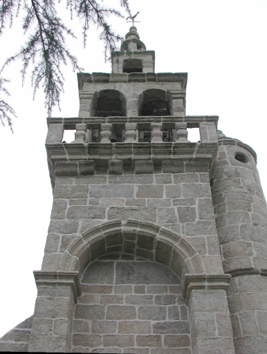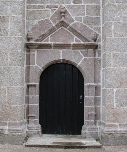 Eglise de style gothique flamboyant et de style classique construite dans un enclos surélevé. Cet enclos, délimité par un mur de clôture, comprend un cimetière, une croix de cimetière, un ossuaire et un monument aux morts. L'église, construite sur un plan en croix latine en moyen et grand appareil de granite (excepté la partie nord), est composée de trois vaisseaux (une nef et deux bas-côtés), d'un transept dissymétrique et d'un choeur constitué par le prolongement du vaisseau central. Elle comprend également un ossuaire dans l'angle sud-ouest, un porche d'entrée au sud et une sacristie dans l'angle sud-est. Elévation extérieure : Le massif occidental, de type Beaumanoir (variante), est ouvert d'une porte en plein-cintre surmontée d'un fronton triangulaire orné de boules godronnées. Il est composé d'une tour centrale de plan en H portant une galerie à balustrade et un clocher à trois baies. L'étage de cloches est desservi par un escalier en vis en maçonnerie abrité dans une tour circulaire placée à droite du clocher. L'élévation nord, restaurée, est ouverte d'une porte en plein-cintre surmontée d'une archivolte à crochets et fleuron retombant sur des pilastres couronnés de pinacles. Le bras du transept est ajouré d'une grande baie de style gothique flamboyant. L'élévation est se caractérise par la présence d'un chevet de type Beaumanoir, à trois pans-pignons et noues multiples prolongées par des gargouilles. Dans l'angle sud-est, la sacristie, de plan massé, présente un toit en croupe plus bas que le toit principal de l'église. Le bras sud du transept est également ajouré d'une grande baie de style gothique flamboyant. L'élévation sud présente un porche d'entrée ouvert d'une porte en plein-cintre et d'une porte intérieure de même composition. L'espace intérieur est couvert d'une charpente apparente. Le couvrement primitif était toutefois formé par une voûte d'ogives dont il subsiste uniquement à chaque angle l'amorce d'un arc. A l'angle sud-ouest, abrité sous le versant du toit principal, l'ossuaire est ajouré de six baies sous arcatures trilobées disposées de part-et-d'autre d'un bénitier surmonté d'un jour sous arcature trilobée. Elévation intérieure : L'espace intérieur de la nef est couvert par une charpente lambrissée en berceau plein-cintre avec entraits apparents, et les bas-côtés sont couverts d'un demi-berceau lambrissé. L'élévation intérieure est formée au nord par cinq grandes arcades tantôt en arc brisé, tantôt en arc cintré, à deux voussures, retombant par pénétration directe sur des piliers cylindriques et octogonaux, au sud par trois arcades du même type.