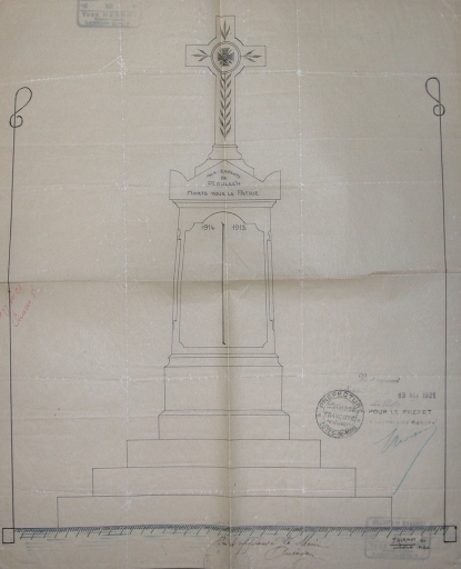 Monument érigé à la fin du 1er quart du 20ème siècle, déplacé en 1939. Il était dressé initialement à l'entrée de l'enclos paroissial. C'est le 18 juillet 1921 que le conseil municipal de Ploulec'h décida d'ériger, à titre d'hommage public, un monument à la mémoire des victimes de la Grande Guerre. Yves Hernot, sculpteur à Lannion, fut choisi pour l'exécution des travaux. Le procès-verbal de réception définitive de l'oeuvre fut dressé le 30 novembre 1921. Le décor en bronze est l'oeuvre de Louis Hernot (signature).