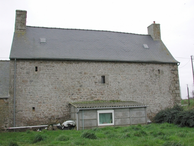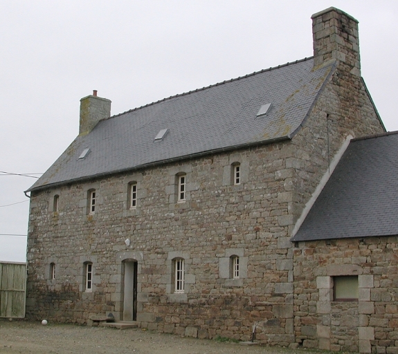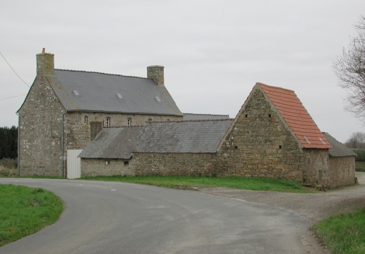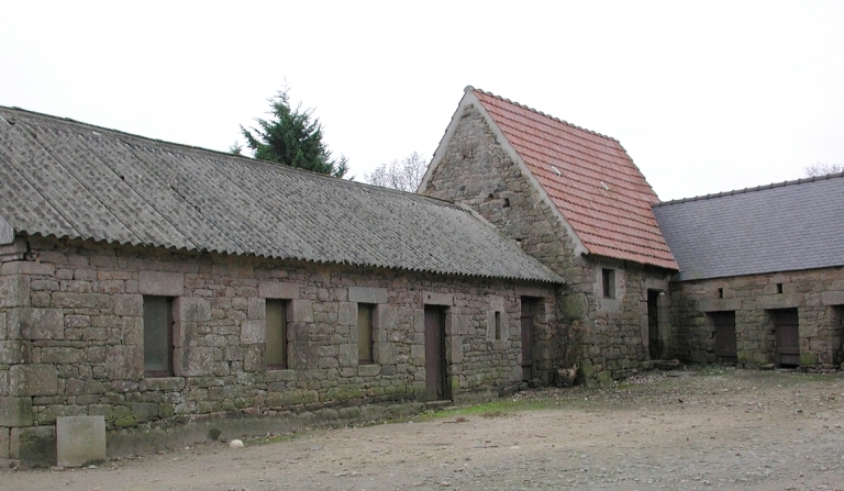 Ferme construite en granite, comprenant des bâtiments à vocation d'habitation et à usage agricole répartis autour d'une cour intérieure ouverte à l'est. L'ensemble forme un plan général en U. Le logis de type ternaire à cinq travées, construit sur un plan simple en profondeur, présente une élévation antérieure ordonnancée. Le linteau de la porte d'entrée porte la date et le nom du commanditaire : " FAIT Faire Par LOUIS GEFFROY 1776 ". L'intrados délardé et cintré est orné d'une étoile sculptée en relief. Le corps de logis est flanqué à droite d'une étable à chevaux plus basse, de plan rectangulaire. La partie agricole comprend également plusieurs bâtiments situés au sud du logis, formant un plan général en L. Cette partie à vocation agricole comprend notamment une ancienne étable à vaches de plan massé couverte d'un toit en tuiles mécaniques. Le linteau de la porte présente l'inscription suivante : " Louis 1767 Geffroy ".