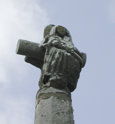 Croix de chemin en granite composée d'un emmarchement à deux degrés portant un soubassement à plinthe moulurée et corniche débordante, d'un socle cubique et d'un haut fût monolithe de section octogonale sommé d'une croix ornée d'un décor en kersanton sculpté en haut-relief (Christ en croix ; Vierge de pitié au revers).