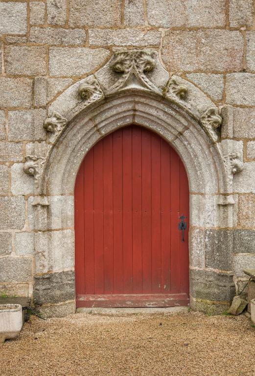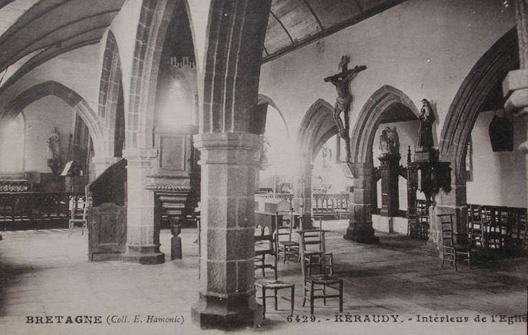 Le village de Keraudy est situé à 5km au sud de Ploumilliau. De l’édifice hospitalier primitif, il ne reste pas de trace, la noblesse locale, particulièrement la famille Quemper de Lanascol, ayant investi l’édifice trévial dès le milieu du XVe siècle. Ainsi, dans une grande majorité, les élévations indiquent une construction dans la première moitié du XVIe siècle. Construite au milieu d’un placître clos, l’église adopte un plan en T à trois vaisseaux et cinq travées dont la dernière est occupée par les bras transepts. La façade occidentale a été fortement remaniée comme en témoigne la reprise de la maçonnerie au premier tiers nord du mur pignon. Le portail occidental est à voussures multiples en arc brisé surmontées d’une archivolte en accolade ornée de crochets et sommée d’un fleuron. Il est encadré de pilastres qui se prolongent au niveau de l’archivolte, mais dont la partie supérieure est amputée, le collage entre les claveaux du portail et le parement extérieur démontre un remaniement total de la façade. Le gable du pignon est coiffé d’un clocher à trois chambres, de type trégorrois. La façade méridionale, à file de pignons, est composée d’ouest en est, d’une lucarne à crossettes de pignons et rampants chanfreinés, son remplage comporte des réemplois comme l’indiquent les piédroits en finies colonnettes toriques rappelant le XIVe siècle. Le portail méridional est en arc brisé à triples voussures à pénétrations directes, le porche est couvert d’une voûte sur croisée d’ogives retombant sur des culots sculptés d’anges banderolés. La clé de voûte est sculptée d’un écu mi-parti, en 1 fretté, un annelet en chef et en 2, fascé, c’est le blason d'Yves de Kerbuzic et de Marie de Goesbriand, mariés en 1530, soit, de sable, fretté d'or, un annelet de même en chef (de Kerbuzic), d’azur à la fasce d’or (de Goesbriand). Le porche abrite un portail orné de piédroits à colonnettes dont le prolongement des deux premières forme deux voussures toriques en accolade. L’archivolte est ornée de crochets et surmontée d’un imposant fleuron et encadrée de pinacles. Le mur pignon du transept méridional est étayé par deux contreforts obliques à simple larmier, son gable est percé d’une baie à trois lancettes trilobées et au réseau ajouré d’écoinçons, mouchettes et soufflets. Les rampants sont lisses et terminés par des crossettes de pignon figurants des visages humains. Le chevet présente de nombreuses reprises de maçonnerie, au niveau des gouttereaux orientaux des transepts et des contreforts du chœur qui ont été remontés lors d’une restauration du parement extérieur. Le chœur est percé d’une baie à trois lancettes trilobées, au réseau composé de quadrilobes, mouchettes et écoinçons, les rampants du pignon sont lisses et deux visages en bas-reliefs forment les crossettes. Le transept nord est identique au transept sud, tandis que la façade septentrionale a été reconstruite presqu’entièrement au XIXe siècle.