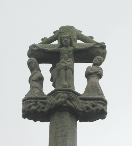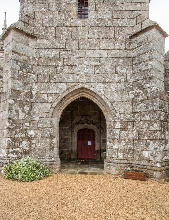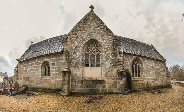 L'église est située dans un enclos surélevé délimité par un mur de clôture construit en moellons de granite. Ce mur de clôture est ouvert d'échaliers au sud et au sud-est, au nord et à l'ouest. L'église est construite en grand appareil de granite sur un plan en tau et se compose d'une nef à 4 travées flanquée de deux bas-côtés, d'un transept et d'un choeur constitué par le prolongement du vaisseau principal. Elle comprend au sud un porche à étage, à usage de secrétairerie, desservi par un escalier en vis en maçonnerie enfermé dans une tour circulaire hors-oeuvre dans l'angle, ainsi qu'une sacristie entre le porche et le bras du transept. Le faîte du toit du porche est plus élévé que le faîte du toit principal. L'élévation sud est rythmée par trois pignons, le chevet est ajouré d'une baie axiale et le pignon ouest est sommé d'un clocher de type trégorrois (clocher à trois baies). Le couvrement du porche sud est formé par une voûte sur croisée d'ogives, celui du vaisseau principal et des bras du transept par une charpente lambrissée en berceau brisé, celui des bas-côtés par un demi-berceau lambrissé. Les élévations sont ornées de baies ayant conservé leur remplage, de gargouilles, de bustes, de crochets et de fleurons. Le calvaire est en granite et se situe entre deux échaliers, à proximité du pignon ouest de l'église. Il se compose d'un soubassement, d'un socle cubique à griffes et d'un fût monolithe sommé d'une croix ornée d'un décor sculpté en haut-relief (groupe de crucifixion à trois personnages à l'ouest et Vierge couronnée à l'Enfant à l'est). La croix du cimetière, située au sud du porche, est taillée dans le granite. Elle se compose d'un soubassement formé par un emmarchement à deux degrés, d'un socle de section octogonale portant une inscription illisible, d'un haut fût monolithe de section circulaire sommé d'une croix en kersanton (rapportée) ornée d'un Christ en croix sculpté en ronde bosse (type Hernot). La sépulture du vicomte de Lanascol est située à proximité du porche sud. Taillée dans du kersanton, elle se compose d'une croix sur socle et soubassement ornée de vigne. Cette croix est précédée d'une tombe ornée d'arcatures trilobées, des armes (d'argent au léopard, de sable, accompagné en chef de trois coquilles rangées de même) et de la devise ("En bon repos") de la famille Quemper de Lanascol.