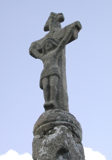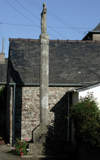 Croix en granite sur socle et soubassement. Haut fût monolithe de section carrée à la base et au sommet, aux angles chanfreinés, sommé d'une croix ornée d'un christ sculpté en relief (côté face) et d'une fleur de lys couronnant le tout. Inscriptions illisibles sur le socle (face et côté droit), dont une date de lecture incertaine.