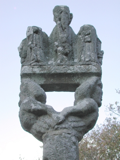 Calvaire en granite érigé sur une sorte de placître à l'embranchement de deux chemins. L'édicule se compose d'un soubassement formé de deux degrés à corniche débordante (deuxième degré également à base moulurée) appareillés de granite en pierre de taille portant un socle cubique aux angles supérieurs abattus. Fût écôté, de section carrée à la base puis circulaire, couronné de deux marmousets portant deux scènes sculptées dans un bloc de granite monolithe (au sud : Christ en croix entouré de deux personnages amputés, probablement Vierge et saint Jean, et ange recueillant le sang des pieds du Christ ; au nord : Vierge de Pitié assistée de deux personnages dont les têtes sont amputées).