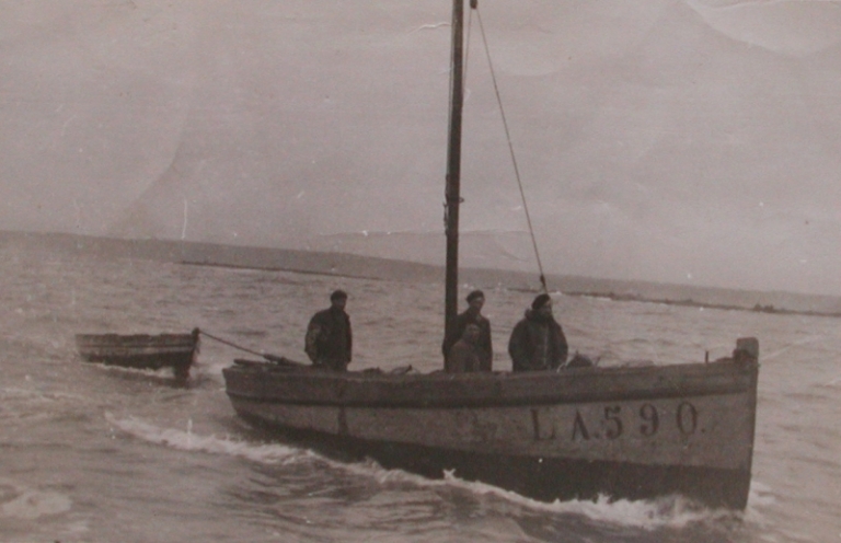 Le chantier "en plein air" de Auguste Levier était situé près de sa maison à l'extérieur. Un hangar en bois lui permettait de ranger son bois de charpente et son matériel manuel. Récit de vie de Georges-Auguste Levier par Annick Le Bon : Georges-Auguste Levier (1880-1952), marin-pêcheur à Locquémeau était aussi un charpentier de marine réputé. L'hiver, il travaillait à l'usine Collet, où l'on construisait aussi des bateaux à côté de l'usine à sardines. C'est dans ce chantier qu'il construisit la "Maïa" pour Yves Levier. Autodidacte, il a construit plusieurs bateaux de pêche (de 6-7 mètres) et de nombreuses annexes, dont le "Chéri de la Manche" LA 590 pour son fils Yves Toussaint, "Les deux frères" pour Pierre-Marie, son deuxième fils, "Alice" pour son usage professionnel et celui de son frère François (vendu ensuite à P. Rolland) et le "Temps perdu" L423 pour son frère, père de Yves Lelous (noyé en 1944 à la pêche au goémon). Il construisait ses bateaux comme ses meubles personnels sans outillage électrique, tout à la main et dehors, sans abri, devant sa maison d'habitation, qu'il avait construite lui-même (murs réalisés avec du sable de mer, des coquilles de berniques pour l'isolation). Ce chantier un peu marginal par rapport au chantier Landouar-Bergot et au chantier Collet avant et après la Seconde Guerre Mondiale était néanmoins reconnu pour ses constructions, en particulier pour ses belles annexes, dont il n'existe plus aujourd'hui aucun exemplaire. Marié à Marie-Perrine Lelous, originaire de Tréduder (parents cultivateurs), il allait pendant l'hiver tuer le cochon et son épouse faisait la charcuterie. La mère de Georges Levier, Augustine Bonny, était mareyeuse ; elle allait vendre son poisson aux halles de Lannion, en compagnie de la femme du pilote Le Pierres du Yaudet. Le grand-père Bonny faisait la pêche pendant l'été avec son sardinier "Les quatre soeurs" et allait travailler pendant l'hiver aux Ponts-et-Chaussées à Rouen. A la fin de sa carrière maritime, Georges Levier pratiquait la pêche à bord du 'C'hoas-Halec" (le "Ruisseau du saule"), immatriculé L 828. Dépositaire d'une licence professionnelle comme armateur à la pêche, il était autorisé à la pêche fraîche (au chalut à perche), à la pêche au maquereau, à la sardine, aux crustacés et au goémon (licence de pêche de 1946). Il mettait aussi des filets de barrage à la plage de Saint-Michel-en-Grève. Il était syndicaliste CGT avec Yves Audern (secrétaire de la section de Locquémeau) du temps de Le Calvez, maire de Locquémeau et marin-pêcheur pendant trente ans, et participait activement à la coopérative des pêcheurs (fermée en 1948). Le "Chéri de la Manche" a coulé avec à son bord Yves-Toussaint Levier et François Lous sur les "Paraux", près de Saint-Michel-en-Grève, à marée descendante (le bateau a pu être renfloué), le jeudi de l'Ascension (23 mai 1952), jour du pardon et de la course des chevaux à Saint-Michel. Les marins étaient en pêche (voile et moteur) au chalut à perche. Ce drame de la mer a beaucoup touché la communauté de marins de Locquémeau et certainement Auguste Levier qui est décédé au mois de novembre de cette année 1952, au moment où l'épopée de la sardine prenait fin.