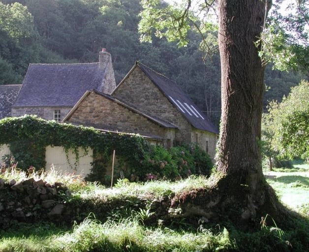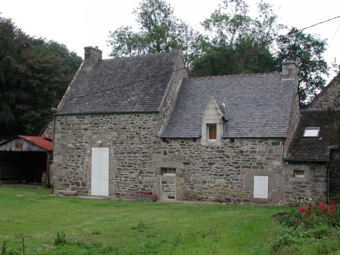 Ferme construite en schiste et granite. Elle est composée de trois corps de bâtiment formant un plan d'ensemble en L, à savoir : deux corps de bâtiment mitoyens, de hauteur différente, et un corps de bâtiment en retour d'équerre à l'avant. Les deux corps de bâtiments mitoyens sont des constructions de plan massé à pièce unique par étage : le bâtiment de droite, probablement à usage d'habitation, est composé d'un rez-de-chaussée ouvert d'une fenêtre à l'avant et d'une porte à l'arrière, et d'un étage carré. Le bâtiment de gauche est composé d'un rez-de-chaussée ouvert d'une porte en plein cintre architecturée et d'un comble à léger surcroît ajouré de lucarnes (rapportées). Le corps de bâtiment en retour d'équerre est une construction de plan rectangulaire allongé comprenant un rez-de-chaussée et un étage carré à deux pièces chacun. Ce corps de bâtiment est ajouré de baies récentes au rez-de-chaussée (restauration) et de baies portant des éléments de décor à l'étage (appui saillant, accolade, traverse et chanfrein).