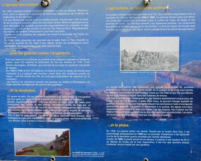 Propriété du Conservatoire du Littoral, le fort de l´île aux Moines inscrit au titre des Monuments Historiques se visite au départ de Perros-Guirec. En empruntant vers l´ouest le chemin de ronde défilé par un parapet, on découvre la caserne et le fort perché sur son rocher. La redoute pentagonale servait de corps de garde et de réduit défensif. Sortant du fort par la grande porte, on chemine vers le phare reconstruit après la seconde Guerre Mondiale. On peut attendre la navette sur la plate-forme de la grande batterie à canon de Cosmoguer en admirant l´île Bono toute proche.
