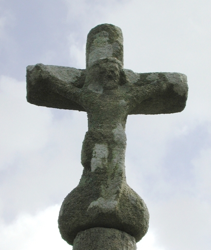 Croix sur socle et soubassement taillée dans le granite. Elle est constituée d'un soubassement portant, en guise de socle rudimentaire, une ancienne meule volante au centre de laquelle est dressé un haut fût monolithe de section circulaire. Le fût est orné au revers, à mi-hauteur, d'une bible et d'un calice sculptés, et sommé d'un Christ en croix en haut relief.