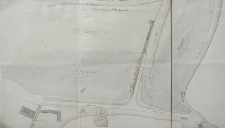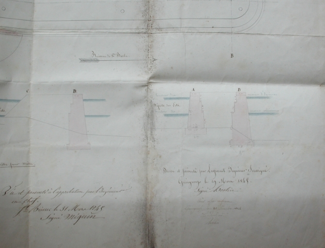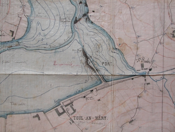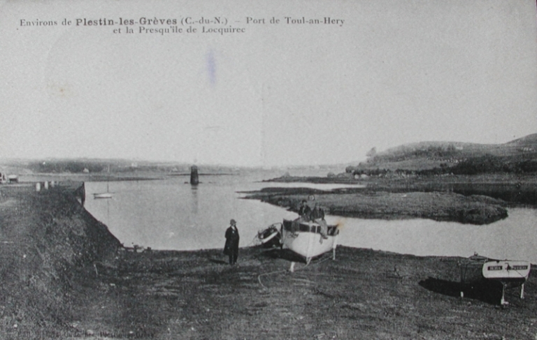 La construction d'un débarcadère au port de Toul an Héry fut projetée en 1840 et la réception des travaux fut effective en janvier 1848. La digue de 70 mètres de long était terminée à l'origine par un quai de 30 mètres, avec un musoir, le long du ruisseau de Sainte-Barbe (AD 22, série S, supl., art. 165). Le pied du quai avait été dévasé à 4,85 mètre, à la cote de mi-marée. La maçonnerie du quai fut réalisée en moellons smillés. Une série de bornes d'amarrage longeait le quai, côté est. Deux aqueducs sur le chemin de Sainte-Barbe permettait de canaliser et de dévier le ruisseau. La digue faisait 6 mètres de large, revêtue en perré, terminée par un musoir circulaire, communiquant avec le chemin vicinal de Toul an Héry, ainsi qu'avec le chemin de Sainte-Barbe. Les ingénieurs projetèrent un nouveau quai de 10 mètres de large et un mur de quai de 100 mètres, depuis le centre de l'ancien musoir jusqu'à l'extrémité du nouveau quai, qui viendrait s'appuyer sur un rocher placé au confluent des deux ruisseaux de Sainte-Barbe et de Pont Menou. Un pallier et une rampe en contrebas des murs du quai, jugés trop hauts s'avéraient aussi utiles ; la largeur du musoir jugée trop faible, une cale pavée de 3 mètres de large aurait aussi été nécessaire. Ces travaux furent réclamés par la mairie de Plestin et les usagers du port. Cependant, ils furent refusés par l'administration centrale en 1849. Le musoir de la jetée fut enfin reconstruit sur un plan de l'ingénieur Dujardin en 1858. Construit en pierres sèche, avec un remblai de sable fin et de la vase (terre-plein), il était régulièrement enfoncé par les navires lourdement chargés. A la fin du 19ème siècle, les murs du quai intérieur furent prolongés du côté du chenal et vers l'amont de la jetée (Pelaud, 1864-1868). Les travaux de prolongement de la jetée vers l'aval furent adjugés en 1883, selon le plan dressé par l'ingénieur Adams. Cependant, ces travaux s'avérèrent moins utiles au gré du traffic décroissant du port à partir de l'année 1899 (4303 tonneaux). Des concessions successives furent accordées à des négociants sur la jetée pendant le 4ème quart du 19ème siècle jusqu'en 1931 : dépôt de marchandise sur le terre-plein du quai, parc à charbon, dépôt de gravier à ciel ouvert, baraque-atelier. Les navires marchands déposaient leur lest comme il était d'usage à l'ouest de la jetée. Cette partie de la jetée où les navires n'accostaient pas s'est dégradée au fil des années ; les murs se sont effondrés et l'envasement a continué comme sur l'autre partie du quai. La forme elliptique du musoir de la jetée lui confère une certaine originalité.