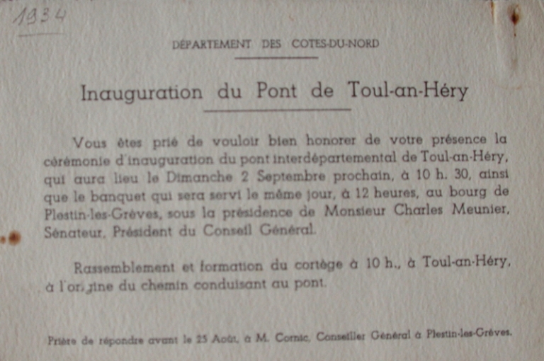 La construction d'un pont sur le Douron était déjà réclamée en 1865-1867 par le conseil municipal de Plestin-les-Grèves, soutenue par une pétition des habitants. Communes du Finistère proche, Guimaëc et Locquirec s'étaient associées à cette démarche, pour les raisons suivantes : - la circulation des hommes et des munitions pour la défense des côtes - Il y avait encore trois embarcations de passage en 1865, pour un trafic croissant - Toul an Héry était le port de commerce le plus proche de Lanmeur, Saint-Jean, Plougasnou et Locquirec - Les courants à cet endroit du Douron étaient rapides et violents, la présence de sables mouvants rendait la traversée dangereuse. - Locquirec exploitait des carrières de moellons et d'ardoises, nécessitant des moyens de transport entre les deux rives du Douron. - Le transport des amendements calcaires du banc du Douron sur 1 km de long et 500 m de large. - La station la plus proche de la ligne de chemin de fer était Plounérin. Un avant-projet des lieux fut déposé en 1867. Les premières études furent dressés en 1874 par l'agent-voyer Courcoux. On pouvait distinguer sur ces plans le moulin Rochelan (aujourd'hui détruit) et son bief. Le profil du pont suivait la ligne du bac de passage, avec les premiers sondages datant de 1867 (10,30 m en hauteur du chemin vicinal côté Plestin et 8,50 m de hauteur en marée d'équinoxe). Le premier plan de 1874 indiquait un pallier de 226 mètres pour une longueur totale de 575,20 mètres. Le pont avait 16 mètres d'ouverture. En 1875, les sieurs Huon de Pénanster (propriétaire de l'usine de sardines de Locquémeau) et Rochelan (propriétaire du moulin de Rochelan) lançaient une pétition pour réclamer une digue carrossable, de préférence à un pont, pour traverser le Douron et favoriser leur commerce respectif ; mais le Conseil général évaluant le projet trop onéreux opposa un refus et s'engagea à l'étude d'un pont. Les travaux débutèrent pendant l'été 1932 et durèrent 2 ans, dirigés par la Société des entreprises Limousin de travaux publics, spécialisée dans le béton armé. Une voie d'accès fut réalisée côté Plestin, pour raccorder l'axe Morlaix-Lannion. Le pont du Douron en béton fut inauguré le 2 septembre 1934, en présence de Cornic, conseiller général du canton de Plestin (qui donna son nom au pont, suite au vote du Conseil général des Côtes-du-Nord) et de Guillemot, sénateur, conseiller général du canton de Lanmeur, avec Ambroise Guillou, maire de Plestin et Le Lay, maire de Locquirec.