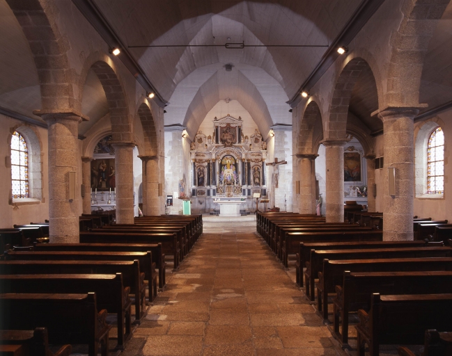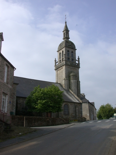 L'église est située en position excentrée par rapport au bourg. Elle possède un plan en croix latine à trois vaisseaux, et est construite en moellon de schiste et granite pour la partie ancienne, en pierre de taille de granite pour le clocher. Sacristie à étage sur le côté sud du choeur avec crypte au rez-de-chaussée servant actuellement de chapelle. Elle abrite le groupe sculpté de la Mise au tombeau. A l'intérieur, le pignon sud du bras de transept conserve deux vases acoustiques. A l'angle sud de l'enclos, est aménagée une fontaine de dévotion adossée au mur de soutènement.