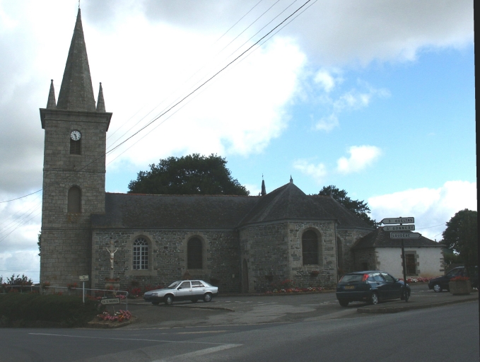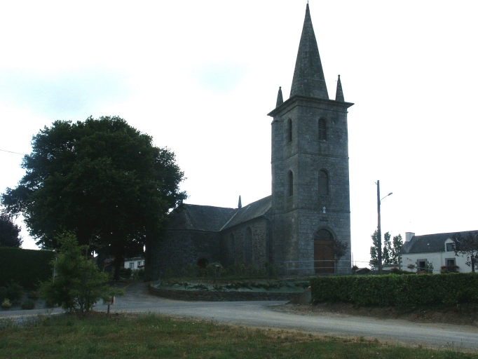 Eglise construite sur les plans de Daniel, ingénieur des Ponts et Chaussées à Loudéac à partir de 1847 (choeur et transept) ; la bénédiction de la première pierre de l'église eût lieu le 27 juin 1847 ; la nef et le clocher furent construits à partir de 1856 et achevés quelques années plus tard : le pavage est posé en 1866. La flèche du clocher et la peinture du lambris de couvrement sont achevées en 1885. D'après le cadastre de 1829, l'église d'alors était entourée du cimetière ; le presbytère est mentionné non loin de là.