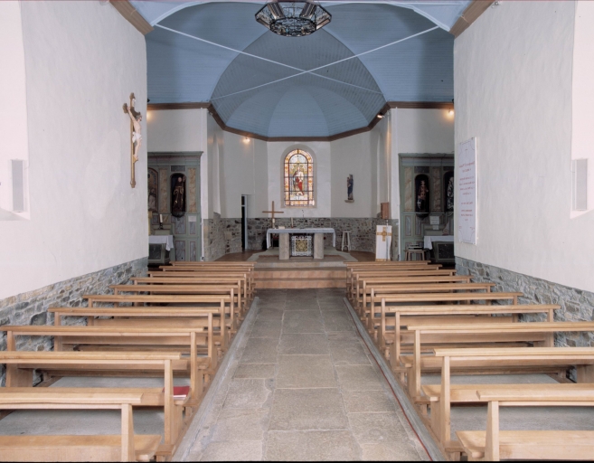 Eglise de plan en croix latine à un vaisseau couvert en lambris dont le chevet et les bras du transept se terminent par trois pans. Sacristie sur le côté sud du choeur. Croix et monument aux morts dans l'enclos côté sud, actuel parking.