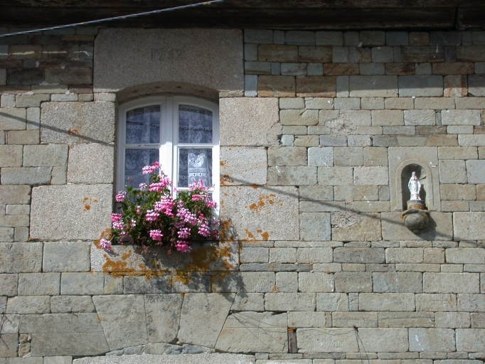 Maison de plan massé à une pièce au rez-de-chaussée et deux pièces à l'étage, construite en petit appareil de schiste et baies en granite ; niche à statuette. Baies à arc en segment.