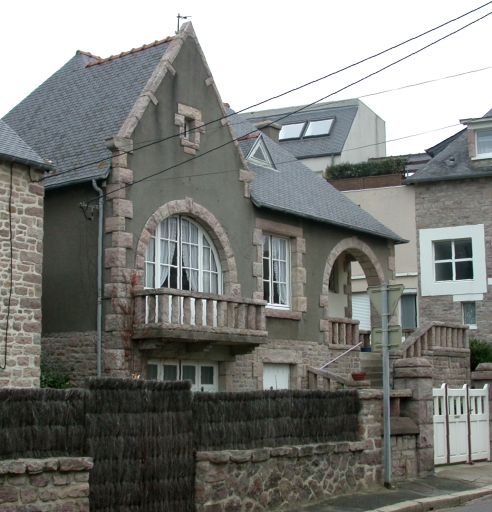 Maison de style régionaliste à deux corps en équerre, à pignon en façade antérieure, construite en grès. L'entrée est abritée sous un porche dans-oeuvre ouvert d'une large baie en plein-cintre. Eléments de décor : baies en plein cintre, pignon découvert, crossettes.