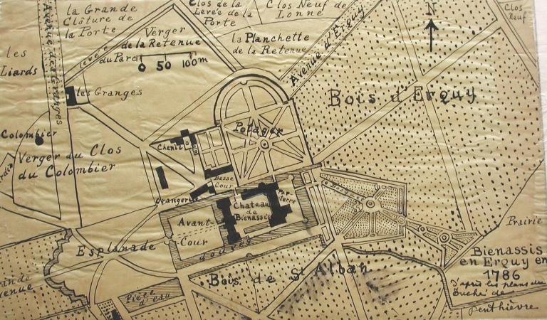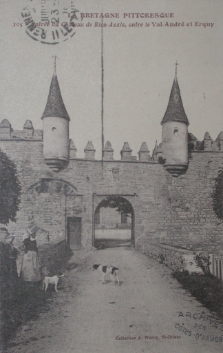 Le château de Bienassis est une construction multiphasée dont les origines remontent au milieu du Moyen Age. Ce château du 15ème siècle, transformé et agrandi au goût de la Renaissance au cours du 17ème siècle, a succédé à un manoir du 12ème ou du 13ème siècle à salle à plan basilical et à ossature de bois cerné d´une douve primitive prolongée au cours de la 1ère moitié du 15ème siècle. Propriété d´une famille dénommée de La Motte au milieu du Moyen Age, probablement seigneurs de La Motte d´Erquy, la terre de Bienassis fut acquise au début du 15ème siècle par Jean de Quelennec, seigneur de Quelennec en Quintin, uni à Tiphaine du Fou en 1374. L'actuel corps de logis a été reconstruit pour Geofroy de Quelennec, fils cadet de Jean de Quelenec, entre 1414, date à laquelle le manoir primitif est déclaré en ruine, et 1434, date à laquelle l´existence d´un manoir neuf est attestée. Une enquête datée de l'année 1434 stipule en effet que le manoir primitif « estoit mal logé et y avoit une ancienne salle gasté et vidé, laquelle ledit Geoffroy [de Quellenec] a fait tresbien réparer et édiffier et auxi y a fait une meson neufve ». Occupé par les troupes du duc de Mercoeur pendant les guerres de la Ligue (fin du 16ème siècle), il a connu d´importantes transformations et a été agrandi vers l´ouest au cours du 17ème siècle. D´après Gwyn Meirion-Jones et Michael Jones, les travaux furent entrepris par Gilles Visdelou, seigneur de La Goublaye en Saint-Alban, et son épouse Françoise de Quelennec, qui consacrèrent toute leur attention à la reconstruction de l´entrée de la cour (pont, mur, porche et pavillons d´angle) durant la première décennie du 17ème siècle. Toujours selon les mêmes sources, il est très probable que le mur d´enceinte actuel date du 15ème siècle et qu´il fut modifié lors des travaux de transformations du début du 17ème siècle. Jusqu´à la fin du 17ème siècle, la deuxième campagne de travaux concerna l´ensemble du corps de logis. Plusieurs modifications d´ordre structurel motivées par la recherche d´un plus grand confort et de l´intimité (surélévation du rez-de-chaussée, ajout de cloisons et de boiseries, insertion de plafonds/planchers) furent entreprises et la façade antérieure fut rhabillée au goût du jour. Le corps de logis fut agrandi vers l´ouest d´une nouvelle cage d´escalier et d´un corps de bâtiment, puis la tour d´angle antérieur gauche du 15ème siècle fut rebâtie à l´extrémité du nouveau bâtiment. Sous la revolution, le château et son domaine ont été confisqués et vendus comme bien national. Les propriétaires du château entreprirent au cours du 19ème siècle et au début du 20ème siècle une réorganisation de l´espace bâti essentiellement dans la cour intérieure (c´est de cette époque, plus précisément vers 1905, que date notamment le bâtiment dit du dôme de l´horloge). Les façades et les toitures, le grand escalier, la grande avenue et le jardin, ainsi que la poterne d'entrée ont été classés Monument Historique par arrêté du 29 août 1945.