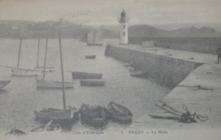 En 1883, fut évoqué le premier projet de construction d'un phare de 4ème ordre à la pointe des Châtelets (section A 1015), selon le rapport de l'ingénieur Guillemoto du service des Phares et Balises, qui soutenait une pétition des marins et négociants d'Erquy : Pour faciliter la navigation entre Erquy et Fréhel, et pour signaler la route à suivre au moyen de deux feux, pour se rendre sans danger à Binic et à Portrieux. 30 bateaux de pêche (120 marins) animaient à cette époque le port d'Erquy selon le syndicat d'Erquy. Le projet initial fut abandonné au profit de la réalisation d'un phare à l'extrémité de la nouvelle jetée d'Erquy, sur les plans des ingénieurs Thièbaut et Ficatier, approuvé par Guillemoto, datés de 1897-98. L'appareil de la lanterne (avec boule et girouette) provenait des établissements Henry Lepaute. Le phare fut mis en service le 9 février 1899. Eclairé à son neuvage au pétrole, le phare fut ensuite électrifié en 1936 avec une batterie. Il est classé comme feu d'horizon à occultations.