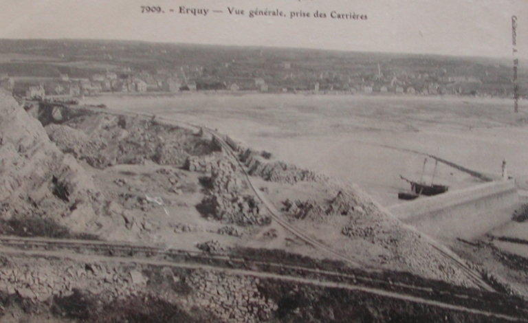 Depuis longtemps, on savait tirer parti à Erquy de la présence abondante du grès rose pour la construction, mais l'on se contentait d'exploiter les affleurements naturels de la Garenne (les pierres de Garenne) et les escarpements du bord de mer (le poudingue). La famille Dolledec d'Erquy à la fin du 18ème siècle avait commencé cette exploitation. Cependant, les premières carrières ne furent véritablement ouvertes qu'au début du 19ème siècle, par les familles de maçons, aux abords du Pendu (famille Cholet) et du sémaphore (Dagorn, Rault, Le Gentil). En 1848, l'extraction se développa avec l'ouverture de la carrière du Maupas (le Lac Bleu) dont on tira les matériaux d'empierrement nécessaires à la réalisation de la route nationale. En 1854-55, la commune accorda l'exploitation des pointes rocheuses autour de Saint-Michel à Barrier, entrepreneur au Mans, qui utilisait le grès rose pour le pavage des rues. En 1891-92, la Société des Carrières de l'Ouest racheta la société Barrier et fit l'acquisition de toutes les carrières ouvertes sur le cap d'Erquy entre le Noirmont et les Trois Pierres, puis jusqu'à Pléhérel. Elle se lança dans l'exploitation industrielle du grès rose, essentiellement tournée vers l'exploitation des pavés. En 1866, la construction du Port Barrier inaugurait le développement commercial des carrières (pavés) par la voie maritime. A la fin du 19ème siècle et au début du 20ème siècle, les carrières emploient jusqu'à 400 ouvriers. Le dernier bateau à vapeur transportant le grès s'appelait le "Quartzite". Une partie du personnel des carrières était logée sur le port. Le village de la Fosse Eyrand fut réalisé par la Société des Carrières de l'Ouest pour loger ses ouvriers occupés à l'exploitation des carrières voisines, transformées aujourd'hui en centre de vacances. Les carrières exploitées par des artisans répondaient aux besoins d'une clientèle locale et fournissaient des cheminées, linteaux et entourages de portes et fenêtres, poteaux de hangar et d'entrée de champ, dalles pour le sol, moellons de maçonneries et d'énormes masses de remblais utilisées pour les routes et les chemins. Au fond des carrières, les ouvriers s'abritaient derrière un rudimentaire clayonnage. L'activité des carrières fut à son maximum entre 1900 et 1927, puis la production s'affaiblit progressivement, victime de la concurrence et d'un manque de mécanisation. Les sites les plus favorables avaient été exploités sans ménagement et l'urbanisation aux abords des carrières de Tu es Roc interdit l'extension de celles-ci. A partir de 1914 : fermeture de l'extraction par creusement sur le cap devenu les "lacs Bleus". En 1930, les carrières de la Fosse-Eyrand périclitent. Cependant, en 1943, les Allemands relancent l'exploitation de la Fosse-Eyrand pour produire le granulat nécessaire à la construction du Mur de l'Atlantique. A partir des années 1950, La Société des Carrières de l'Ouest délaisse la production de pavés pour celle des granulats. Les carrières furent définitivement fermées en 1960. Le barrage de la Rance fut construit en 1961-65 avec les débris de la carrière de la Fosse Eyrand. La construction du nouveau port de pêche fut réalisée en 1971 avec les débris amassés jusqu'en 1937-38 à proximité. Cependant, en 1986, la SARL Grès et Tradition d'Erquy reprenait une partie de la concession (sous l'ancien sémaphore, avec un lieu de vente située à la Couture). Depuis 1991, l'extraction a recommencé sur Erquy. Cette entreprise produit des moellons, parements, pavés, cheminées et mobilier poli. A Fréhel, existe la dernière entreprise locale appartenant à la Société des Carrières de l'Ouest. Elle a pu perdurer, grâce à sa reconversion, vers les années 1950, dans la production industrielle de granulats. Nous avons repéré deux œuvres sur le circuit des carrières de la pointe d'Erquy : les bâtiments en partie en ruines de la forge au-dessus du port et l'ancienne poudrière sur le site de Port-Blanc. L'étude de la forge a été effectuée.
