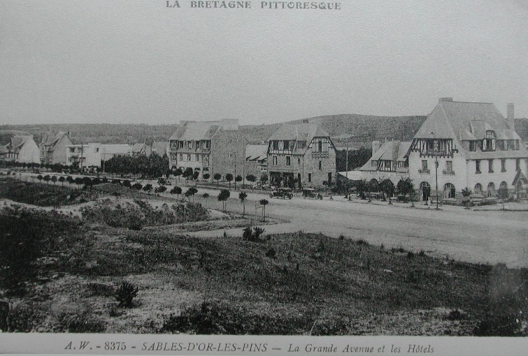 Les œuvres repérées datent de la fin du 1er quart du 20e siècle et du 2e quart du 20e siècle. Sables-d´Or-les-Pins est une station balnéaire inachevée dont l´histoire remonte au début des années Vingt. Elle est établie sur les « dunes du Minieu », antérieurement dénommées « dunes de l´Hôpital », où furent mis au jour au cours des années Soixante-dix les vestiges d´une villa de la fin du 2ème siècle ainsi qu´une sépulture collective du Bas-Empire. Le site fut découvert avant la Première Guerre mondiale par un agent immobilier de Paramé, Roland Brouard (1887-1934), qui, associé à Bernard Launay, acheta le 2 décembre 1921 à la famille de Courville quatre-vingt-dix hectares de dunes et de bois bordant la grève du Minieu. Décidé à créer « la première station du monde pour les sports nautiques » capable de rivaliser avec La Baule et Deauville, incluant d'emblée dans son projet une dimension architecturale, il s´attacha alors les services du géomètre Larieux, auteur du plan de lotissement des dunes, des frères Treyve, célèbres paysagistes vichyssois, et de deux architectes, Yves Hémar (1896-1955) et Hyppolite Abraham (1891-1966). Le 15 avril 1923, il fut en mesure d´annoncer à la presse nationale et internationale la création d'une station balnéaire de 96 hectares. Le dossier d'ensemble du projet fut déposé pour approbation en mairie le 14 décembre 1924 et accepté par le préfet le 23 mars 1925. Pour faire appel aux capitaux extérieurs, Roland Brouard créa la Société immobilière de la plage de Sables-d'Or le 2 mai 1925. Le projet déposé en mairie en 1924 fut en quasi totalité exécuté. Dotée d´équipements hôteliers, de magasins et d´équipements de loisirs (golf, casino, tennis ...). Sable-d´Or-les-Pins fut officiellement ouverte en juin 1925 par une « Fête du tourisme et de l´hôtellerie » associée au Congrès du Syndicat des hôteliers et restaurateurs. Si l´année 1928 fut marquée par l´obtention du titre de station climatique, elle le fut plus encore par la mévente des lots qui inaugura un déclin accéléré par la crise de 1929.
