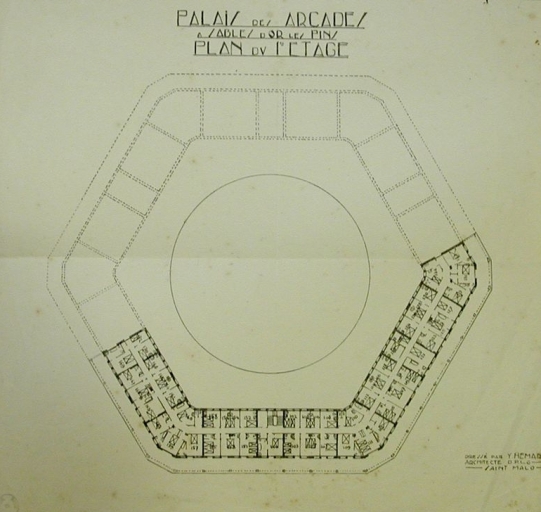L'hôtel des grandes arcades est la première commande privée d'importance de l'architecte Yves Hémar qui, ici, a opté pour une formule alors très en vogue dans les villes nouvelles du Maroc, à l'instar de Casablanca et de Rabat, et totalement inconnue en France métropolitaine.