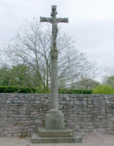Croix de type Hernot taillée dans le granite. Elle est composée d'un soubassement formé par un emmarchement à deux degrés, d'un socle à griffes trapézoïdal et d'un fût monolithe écôté, de section circulaire, portant une croix ornée d'un Christ sculpté en ronde bosse.