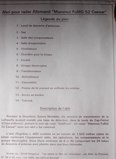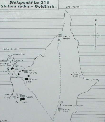 L'abri (Regelbau L 485) fut construit par les usines de l'entreprise Telefunken pendant les années de la seconde guerre mondiale. Le radar Fumo Caesar surveillait la navigation en Manche jusqu'aux côtes anglaises. Les services de transmission de la Luftwaffe avaient développé le radar dénommé "Fumo Caesar" depuis les radars du type "Freya" dans le but de les remplacer pour la détection à grande distance. Cet appareil de radio-repérage d'avions, à grande portée (200 à 300 km), mesurait la distance et le relèvement d'un but sur un secteur avant d'environ 120° avec des secteurs non couverts sur les côtés. Le balayage est réalisé non par une rotation mécanique de l'appareil mais par une rotation électronique du faisceau directionnel dans un domaine angulaire fde +50° au moyen d'un compensateur. Pendant le 2ème guerre mondiale, les services de transmission de la Luftwaffe avaient installé une base de détection, dans la lande du Cap Fréhel, portant le nom de code de "Goldfish". Un radar "Mammut FuMG 52 Caesar", le plus important de Bretagne, avec son abri enterré, y fut installé. L'abri (Regelbau L 485) y fut construit, dont il reste encore aujourd'hui les vestiges relativement bien conservés, sous la lande. Un point de Flack, mesurant 4 m sur 10 m, servant de dépôt pour les munitions et disposant d'une batterie DCA, est situé près de l'abri. Le terrain a été récemment nettoyé.