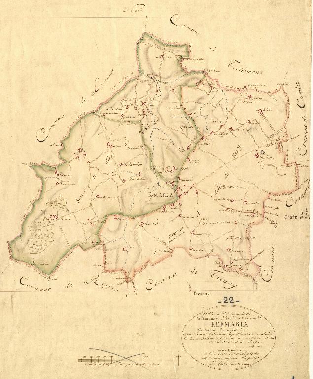 Le cadastre réalisé en 1819 comporte 2 sections : le Bourg (section A en 2 feuilles) et K[er]imel (section B en 2 feuilles) ainsi qu'un tableau d'assemblage. La section de K[er]imel correspond à un manoir aujourd’hui détruit. A l'ouest du territoire communal, le cadastre figure notamment les bois de Kerimel. Le territoire est marqué par plusieurs résidences seigneuriales qui apparaissent sur le cadastre au bourg (mottes féodales), Coattellec (motte féodale arasée), Coataliou, Kergoff, Kerimel, Kerleau et Prat Louët.