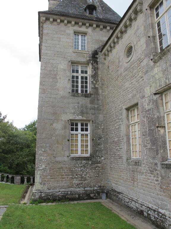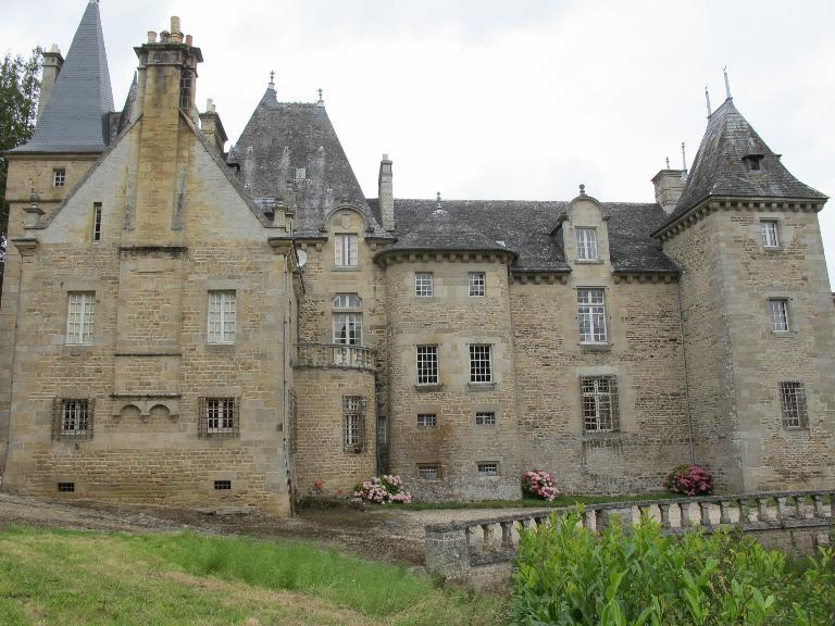 Château et environnement sauvegardé. Plan complexe avec plusieurs décrochements, sur les deux façades, qui sont marqués par des toitures différenciées.