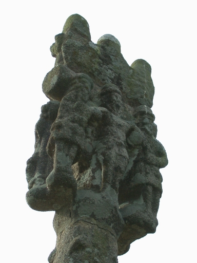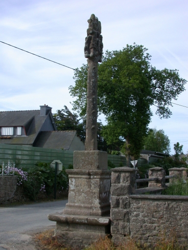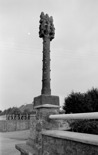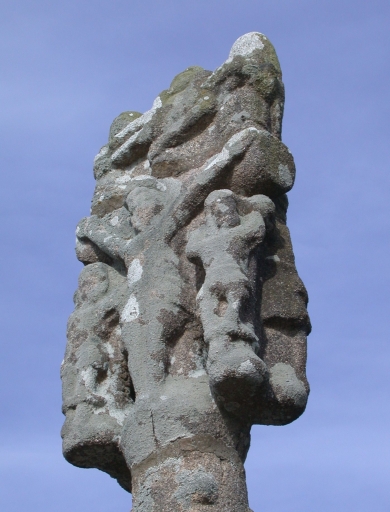 Calvaire sur socle et soubassement en granite.Il est composée d'une base à corniche débordante, d'un soubassement à plinthe et corniche moulurées appareillé en grand appareil et d'un socle cubique portant un fût monolithe écôté sommé d'une croix tableau ornée, à l'avant, d'un groupe de la Crucifixion à trois personnages (Christ en croix entouré des deux larrons) et, à l'arrière, d'un Christ emmené par deux personnages (iconographie en relation avec la déposition de croix). A l'avant, le thème de la crucifixion est surmonté d'une Vierge de pitié à trois personnages (un groupe de trois Saintes Femmes voilées et assises, tenant sur leurs genoux le corps du Christ).