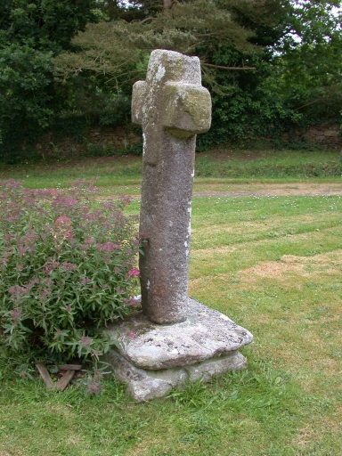Croix monolithe à branches courtes en granite dressée sur un socle. Elle présente un décor schématique à l'avant et à l'arrière (Christ en croix et Vierge).