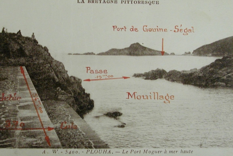 Portz-Moguer est une crique large de 10 mètres, où les goémoniers peuvent accoster à marée haute seulement à l'est d'une petite jetée qui relie une roche à la terre. A la demi-marée on talonne sur les têtes de roches le long du môle. C'est l'entrée de la vallée de la Trinité sur la rive droite de laquelle se trouve l'amer de M. Mordellet, notaire. Il y a sur une grève une petite maison qui présente le pignon, avec une fenêtre noire et une cheminée à droite.