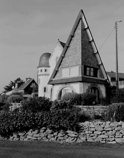 Edifice qui présente de multiples décrochements. Corps principal couvert d'un toit à deux pans et pignons découverts, dont les rampants à crossettes atteignent presque le sol. Décrochement latéral couvert de croupes droites à forte pente, symbolisant les voiles d'un bateau, avec essentage d'ardoise dans la partie haute du mur. Tourelle d'escalier demi-hors-oeuvre, sur l'angle, couverte d'un dome surbaissé à égout retroussé. Gros-oeuvre en moellons de granite enduit, les chaînes d'angles, entourages et couvrements des baies (linteau ou arc plein-cintre) sont en granite gris. Niche décorative dans le pignon de la façade d'entrée. L'ancrage au sol est suggéré par des murs talutés.